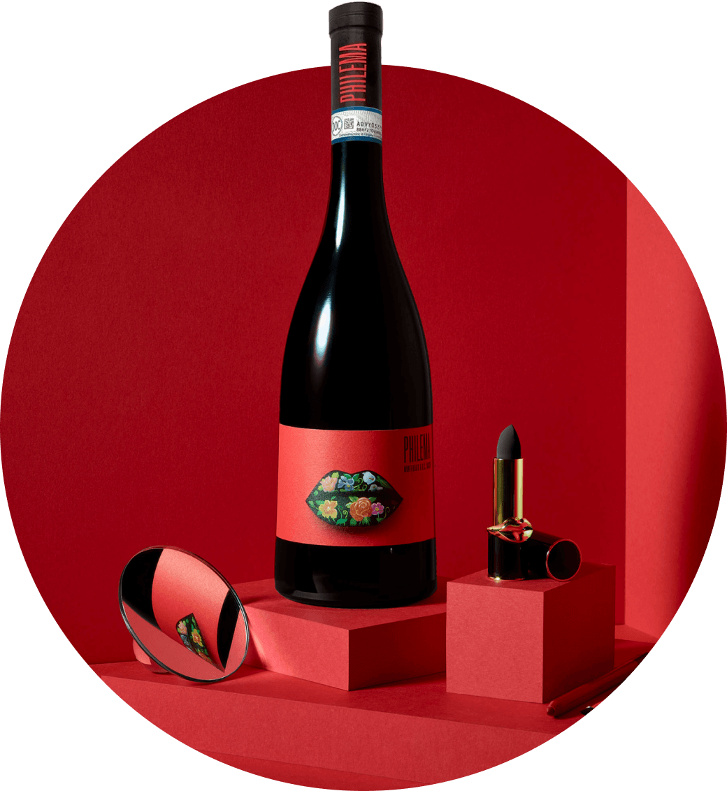 Il nome "Philema" ha ispirato il design. Il colore rosso di fondo attira l'attenzione stimolando emozioni di passione e piacere, entrambe facilmente presenti in situazioni di convivialità. Il coraggioso Key Visual della bocca, dipinta con tema floreale in "stile make up artist", richiama la bellezza e l’essenza di Philema che propone toni fruttati e “colorati” al palato insieme a note speziate di pepe nero
